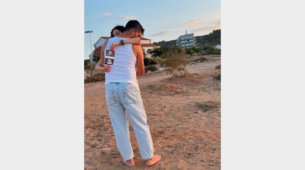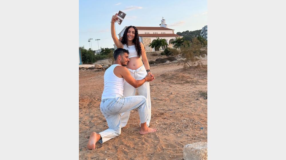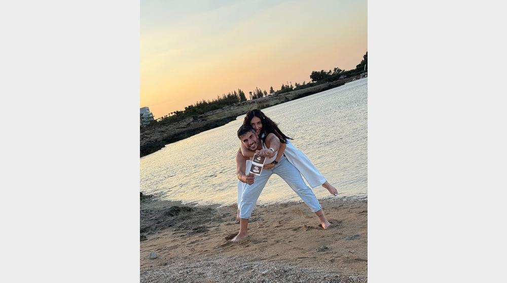 Σε αυτό βλέπουμε τους δυο τους να κρατάνε το υπερηχογράφημα του παιδιού τους, σε ένα όμορφο location της επαρχίας Αμμοχώστου, πλάι στη θάλασσα.