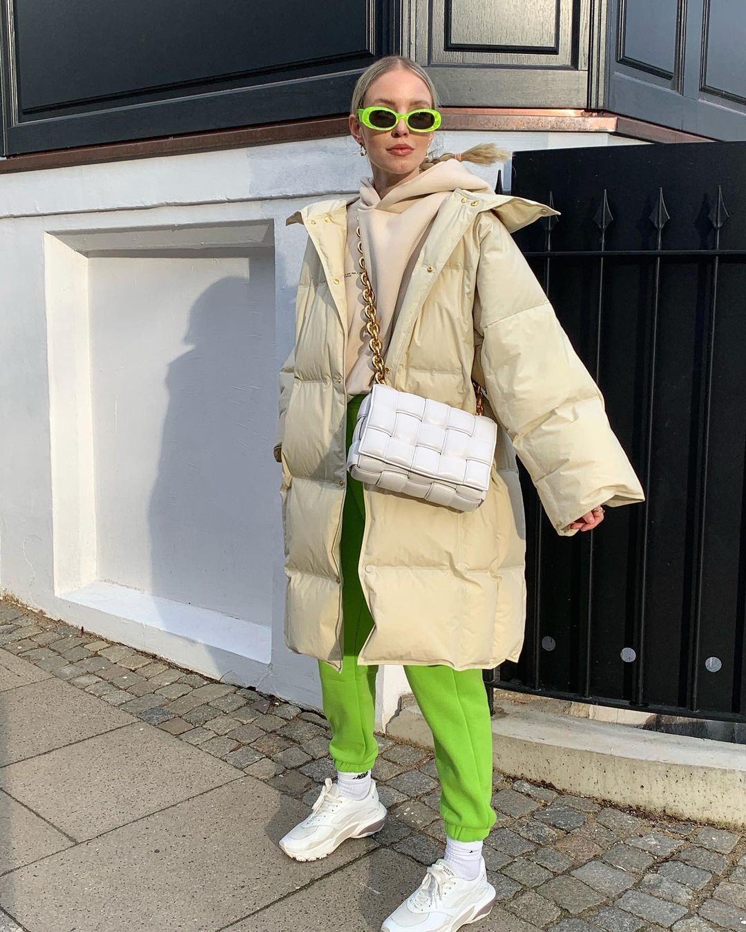 Μπορείς να δημιουργήσεις ένα comfy look επιλέγοντας μια φόρμα σε neon πράσινο και συνδυάζοντας τη με ένα padded coat.