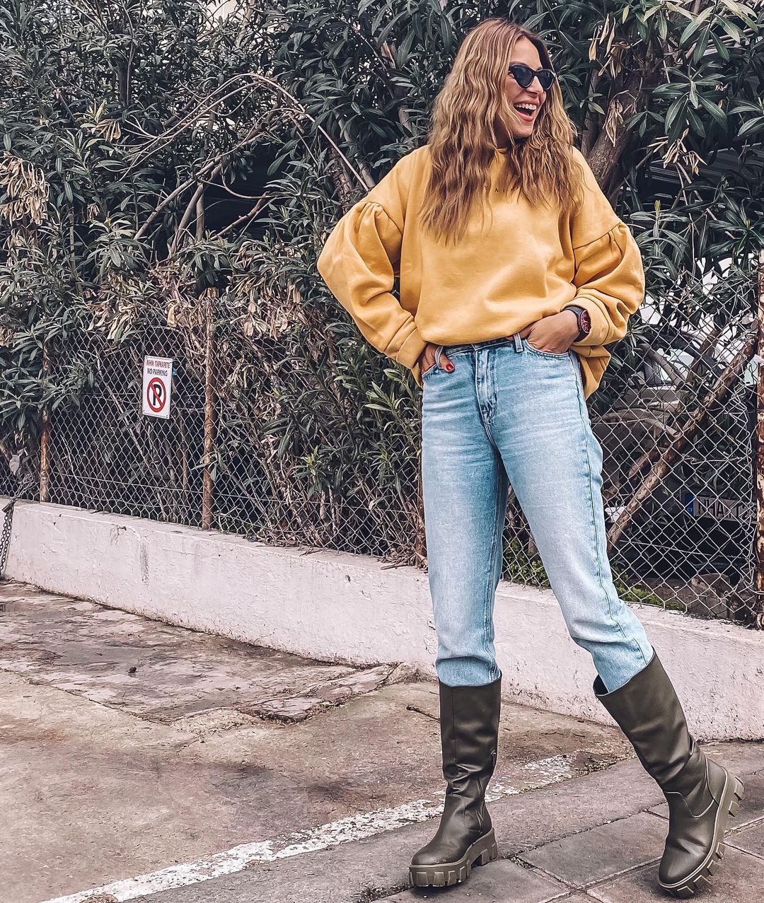 Σε αυτό το look συνδύασε ένα ανοιχτόχρωμο τζιν μαζί με ένα κίτρινο φούτερ, και συμπλήρωσε με φλατ chunky μπότες.
