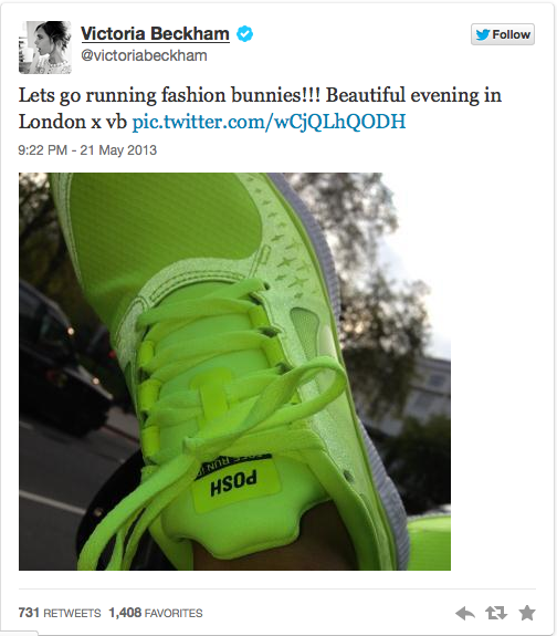 Και να που είναι δυνατόν. Η γυναίκα σύμβολο του posh style, το αφήνει στην άκρη για να φορέσει αθλητικά, ενώ στο παρελθόν έχει δηλώσει πως δεν της αρέσει να βλέπει γυναίκες να βγαίνουν έξω με φόρμες και αθλητικά. Η Victoria Beckham έσπασε το κλισέ του άβολου και formal ντυσίματος, ποστάροντας στο twitter της μία φωτογραφία με το πόδι της να φοράει ένα custom made Nike με το όνομά της- για την ακρίβεια το nickname της 'POSH'. Εντάξει είπαμε ότι φόρεσε αθλητικά αλλά όχι ότι και ότι. Αθλητικά ειδικά φτιαγμένα μόνο για εκείνη. Εντάξει είναι και αυτό μια αρχή!