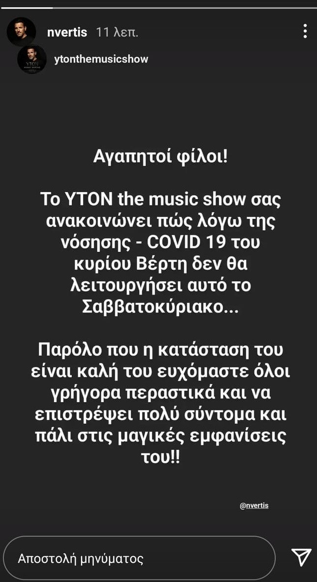 Συγκεκριμένα ο Νίκος Βέρτης σχολίασε:"Aγαπητοί φίλοι, το YTON the music show σας ανακοινώνει πως λόγω της νόσησης COVID-19 του κυρίου Βέρτη δε θα λειτουργήσει αυτό το Σαββατοκύριακο. Παρόλο που η κατάσταση του είναι καλή, του ευχόμαστε όλοι γρήγορα περαστικά και να επιστρέψει πολύ σύντομα και πάλι στις μαγικές εμφανίσεις τους ήταν η ανάρτηση του "YTON". Δείτε την εικόνα πιο κάτω: