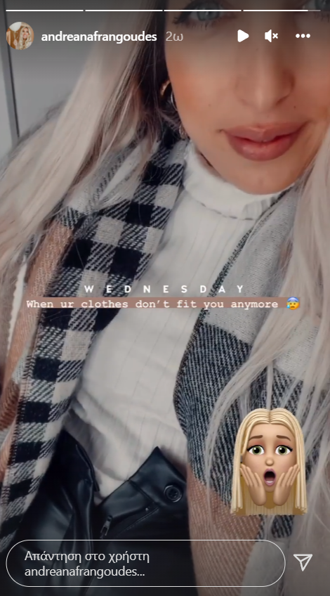 Μάλιστα πρόσφατα, η Ανδρεάνα Φραγκούδη, σε instastory που ανήρτησε στον λογαριασμό της, μοιράστηκε μαζί με τους followers της, το γεγονός πως τα ρούχα της και πιο συγκεκριμένα τα παντελόνια της, της έχουν μικρύνει, μιας και η κοιλίτσα της αρχίζει να φουσκώνει, και τα κουμπιά με δυσκολία κουμπώνουν. Δείτε την εικόνα πιο κάτω: