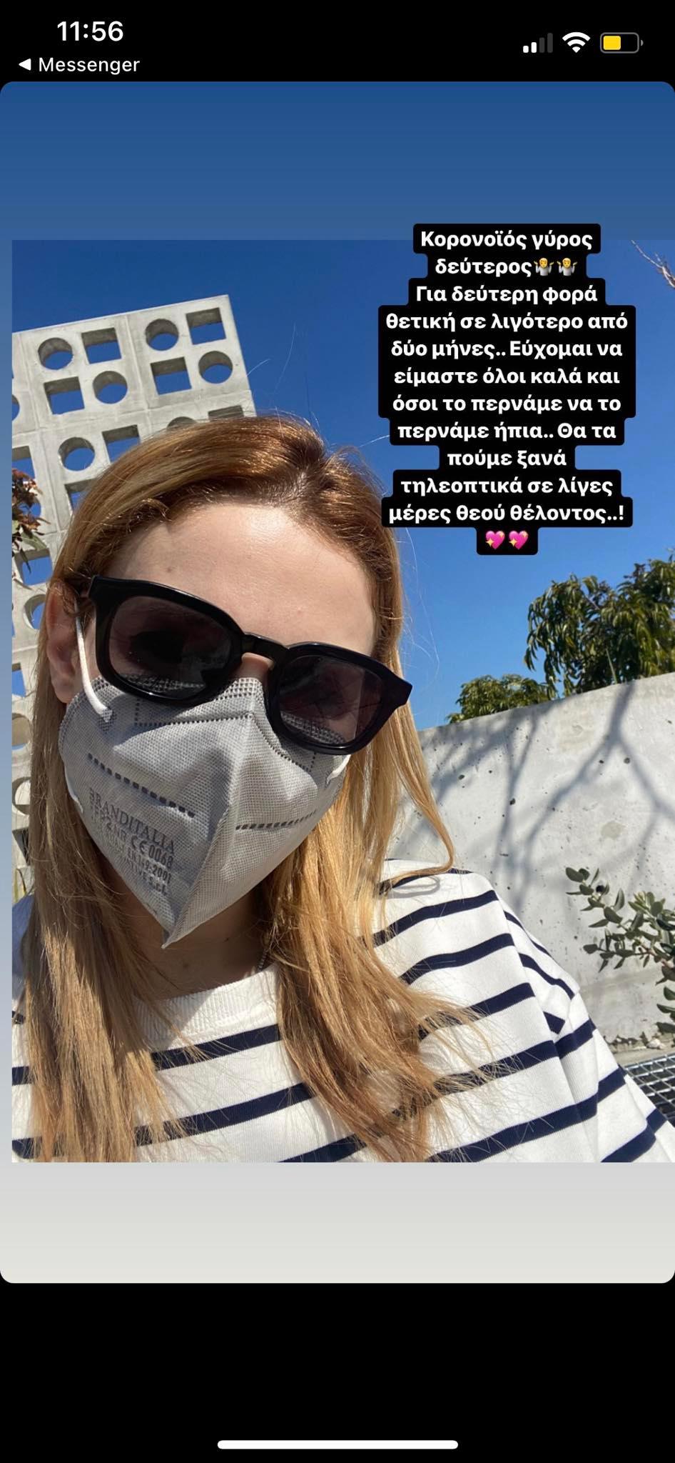 “Κορωνοϊός γύρος δεύτερος. Για δεύτερη φορά θετική σε λιγότερο από δύο μήνες. Εύχομαι να είμαστε όλοι καλά και όσοι το περνάμε να το περνάμε ήπια. Θα τα πούμε ξανά τηλεοπτικά σε λίγες ημέρες θεού θέλοντος”, έγραψε η παρουσιάστρια ποζάροντας στην αυλή του σπιτιού της με μάσκα. Δείτε πιο κάτω τη σχετική εικόνα: