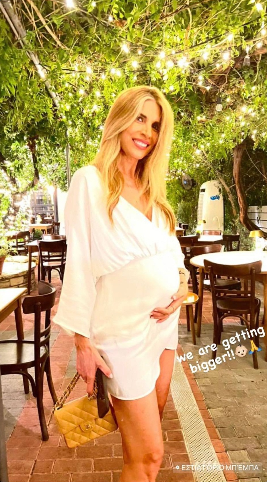 Επέλεξε ένα chic maternity look φορώντας λευκό μίνι φόρεμα και πόζαρε κρατώντας τη φουσκωμένη της κοιλίτσα, γράφοντας στην εικόνα: “Μεγαλώνουμε...”