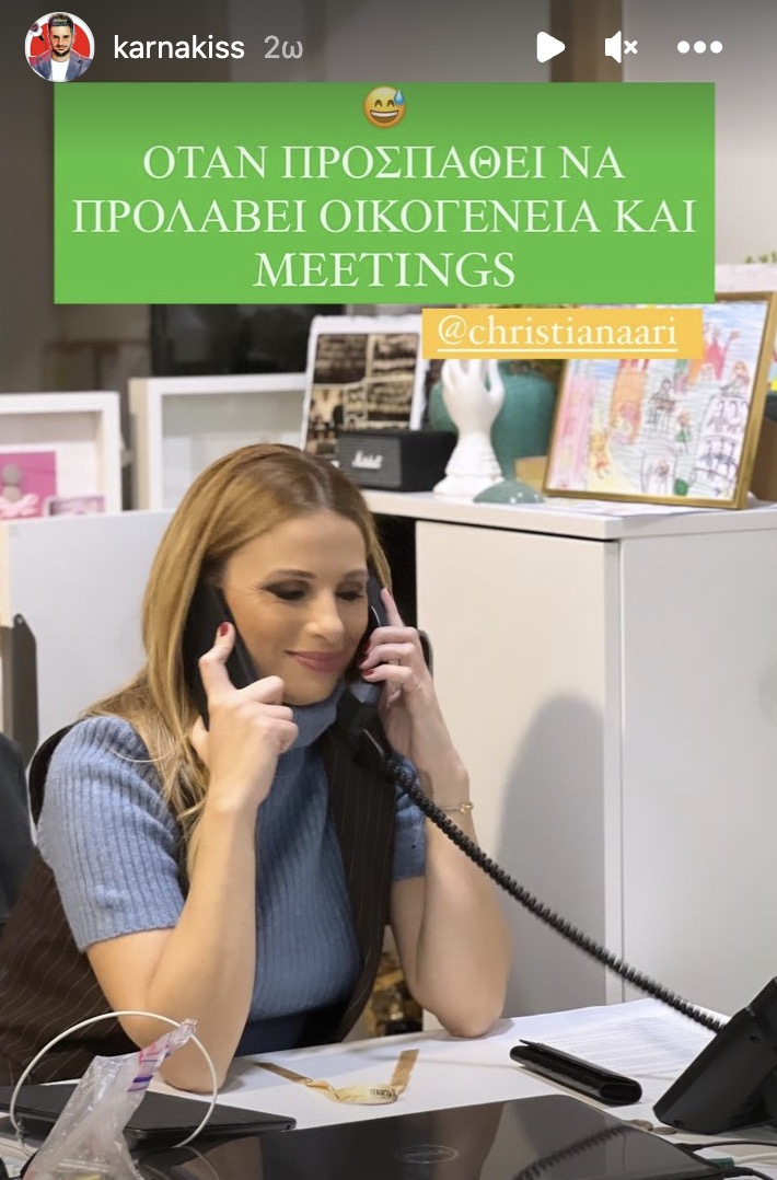 Η Χριστιάνα Αριστοτέλους τα τελευταία χρόνια προσπαθεί και τα καταφέρνει εξαιρετικά να εξισορροπεί καριέρα και η οικογένεια. Προσπαθεί καθημερινά να τα ρυθμίζει όλα στην εντέλεια και τα καταφέρνει. Το απόγευμα της Τετάρτης 13 Δεκεμβρίου ο συνεργάτης της Κώστας Καρνάκης την απαθανάτισε σε μία ιδιαίτερα χιουμοριστική φωτογραφία η οποία δείχνει την καθημερινότητα της.