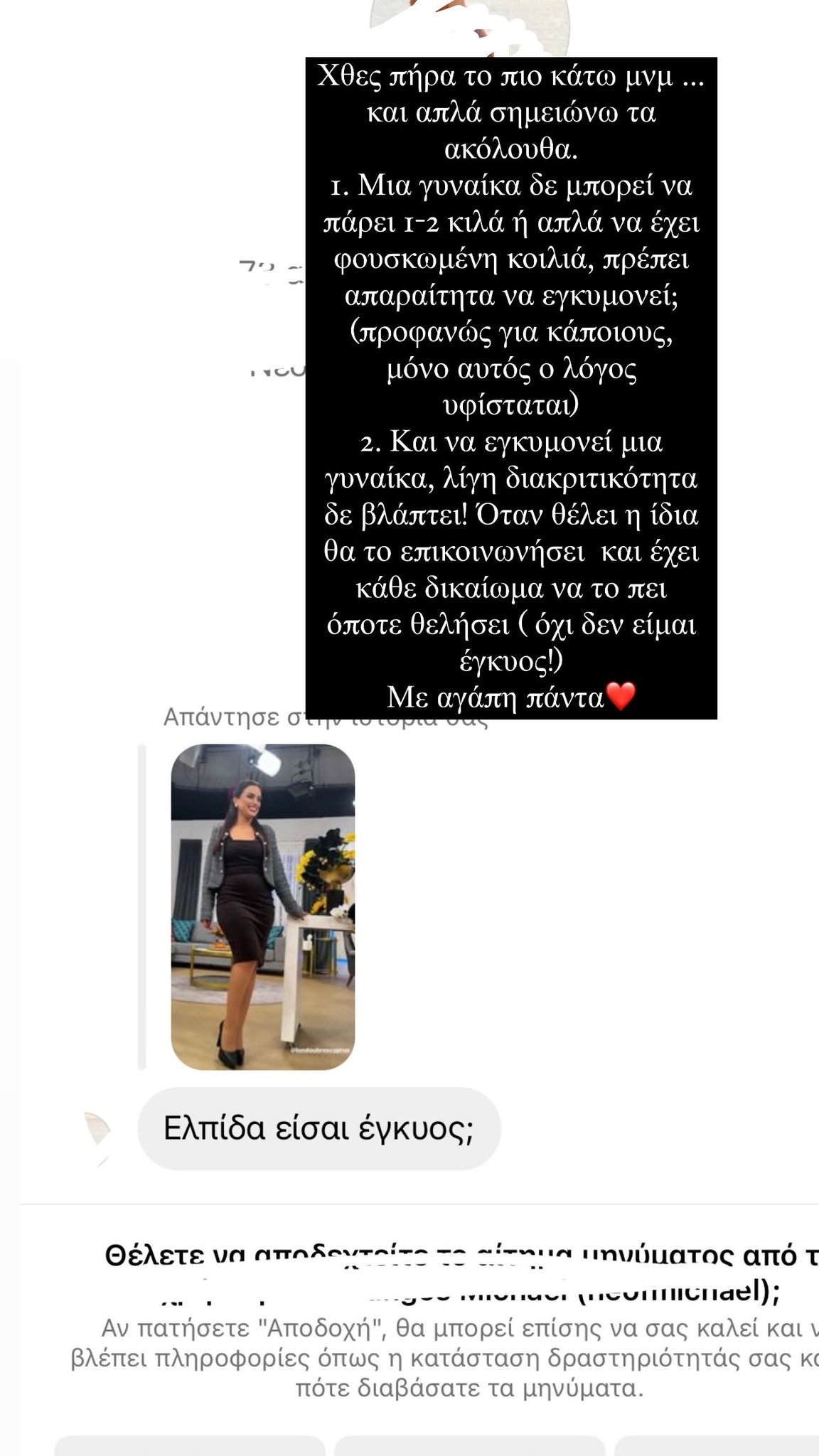 Χαρακτηριστικά πετύχαμε να γράφει τα εξής: "Χθες πήρα το πιο κάτω μήνυμα και απλά σημειώνω τα ακόλουθα. Μια γυναίκα δε μπορεί να πάρει 1-2 κιλά ή απλά να έχει φουσκωμένη κοιλιά, πρέπει απαραίτητα να εγκυμονεί;(προφανώς για κάποιους μόνο αυτός ο λόγος υφίσταται) 2. Και να εγκυμονεί μια γυναίκα, λίγη διακριτικότητα δε βλάπτει! Όταν θέλει η ίδια θα το επικοινωνήσει και έχει κάθε δικαίωμα να το πει όταν θελήσει(όχι δεν είμαι έγκυος)Με αγάπη πάντα". Δείτε την εικόνα: