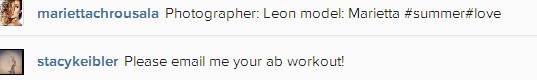 Σίγουρα διαθέτει ένα από τα πιο καλλίγραμμα σώματα της ελληνικής showbiz και με αυτή τη φωτογραφία το αποδεικνύει περίτρανα. Όποια βλέπει αυτή τη φωτογραφία σίγουρα ζηλεύει τους κοιλιακούς της Μαριέττας και μία από αυτές και η Stacy Keibler, η πρώην σύντροφός του George Clooney η οποία σχολιάσε τη φωτογραφία που ανέβασε στο instagram η Μαριέττα λέγοντάς της να της στείλει τις ασκήσεις κοιλιακών που κάνει στο email της.