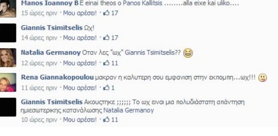Η παρουσιάστρια πόσταρε μια φωτογραφία της στον προσωπικό της λογαριασμό στο facebook και άλλαξε την εικόνα του προφίλ της! Την εν λόγω φωτογραφία σχολίασε ο αγαπημένος της, Μάνος Ιωάννου γράφοντας: «Είναι θεός ο Πάνος Καλλίτσης, αλλά είχε και υλικό». Η Ναταλία πήρε το κομπλιμέντο της ακόμα και μέσω facebook! To ζευγάρι δεν κρύβει τον έρωτά του και ακόμα και στα social media δεν λείπουν τα πειράγματα. Όσο και αν τα δημοσιεύματα τους θέλουν να έχουν χωρίσει αυτοί φαίνεται ότι ακόμη παιρνούν καλά!