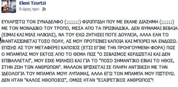 «Οι πρώτοι που κράζουν είναι οι συνάδελφοι. Ήταν μια συνάδελφος πέρυσι με ένα περιστατικό που είχε γίνει και έλεγε” ο σεβασμός δεν απαιτείται κερδίζεται”. Όχι, ο σεβασμός απαιτείται δεν κερδίζεται. Συνάδελφοι που σε παρακαλούν να τους πάρεις στη δουλειά, έτσι. Αυτό ήταν με μια συνάδελφο την Ελένη Τζώρτζη… Μια αγενέστατη συνάδελφος, η οποία άστο τώρα εντάξει… Συνάδελφος τέλος πάντων…» είπε ο ηθοποιός. Φυσικά εκείνη δεν το άφησε να πέσει κάτω και του απάντησε μέσα από τον προσωπικό της λογαριασμό στο facebook. Δείτε στην φωτό που ακολουθεί την ανάρτησή της.