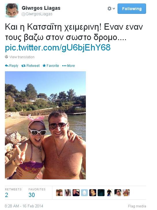 Οι δυό τους φωτογραφήθηκαν με τον παρουσιαστή να ανεβάζει τη φωτο στον λογαριασμό του στο twitter λέγοντας: «Και η Κατσαΐτη χειμερινή! Έναν έναν τους βάζω στον σωστό δρόμο...»