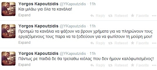 Xθες ακούστηκαν πολλά για τον φωτισμό που είχαν ο Γιώργος Καπουτζίδης και η Δέσποινα Βανδή. Ο ίδιος απάντησε σκληρά μέσα από το λογαριασμό του στο twitter τονίζοντας ότι τα κανάλια καλύτερα να δίνουν χρήματα για τους εργαζόμενους παρά για να φωτίσουν τη μούρη του!
