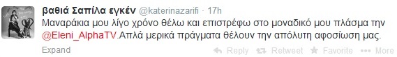 Από τις 27 Μαρτίου απουσιάζει η Κατερίνα Ζαρίφη από την εκπομπή της Ελένης Μενεγάκη. Η Κατερίνα μετά από την ανησυχία των διαδικτυακών της φίλων έγραψε στο twitter ένα μήνυμα: "Ευχαριστώ για το ενδιαφέρον πουλάκια μου. Όταν θα ξαναέχω καθημερινότητα θα τα πούμε.." Η Κατερίνα Ζαρίφη εδώ και δύο μέρες πηγαίνει κανονικά στη ραδιοφωνική της εκπομπή. Στο νέο μήνυμα που έγραψε στο twitter αναφέρει: «Μαναράκια μου λίγο χρόνο θέλω και επιστρέφω στο μοναδικό μου πλάσμα @Eleni_AlphaTV. Απλά κάποια πράγματα θέλουν την απόλυτη αφοσίωση μας».
