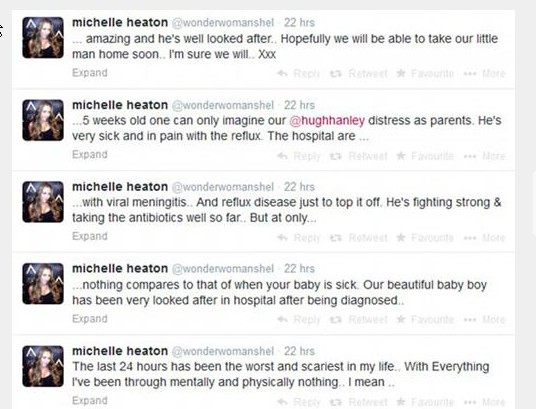 Δύσκολες ώρες περνά η 34χρονη Βρετανίδα τραγουδίστρια Michelle Heaton μετά την διάγνωση των γιατρών ότι ο μόλις 5 εβδομάδων γιος της έχει προσβληθεί από μηνιγγίτιδα. Το μωράκι μεταφέρθηκε στο νοσοκομείο το Σαββατοκύριακο. Η Michelle Heaton κάτω από την συναισθηματική φόρτιση για όλα όσα έχει περάσει το τελευταίο εικοσιτετράωρο η ίδια και το μωρό της Aaron, έγραψε στο twitter: “Οι τελευταίες 24 ώρες ήταν οι πιο δύσκολες και τρομακτικές της ζωής μου”. Επιπλέον ο γιος της Michelle Heaton ταλαιπωρείται και από γαστροοισοφαγική παλινδρόμιση, κάτι που είναι σύνηθες στα μωράκια αλλά όπως όλα δείχνουν, θα χρειαστεί να παραμείνει πολύ καιρό στο νοσοκομείο όπου θα λαμβάνει συνεχώς την φροντίδα των γιατρών και την απαραίτητη φαρμακευτική αγωγή ιδίως για τη μηνιγγίτιδα. Η Michelle Heaton ωστόσο αν και περιγράφει ως εφιαλτικές τις στιγμές που ζει αυτή την περιόδο προσπαθεί να κάνει ότι περνά από το χέρι της για να στηρίξει την οικογένειά της και να βρίσκεται στο πλευρό της δίχρονης κόρης της που την έχει τόσο πολύ ανάγκη.