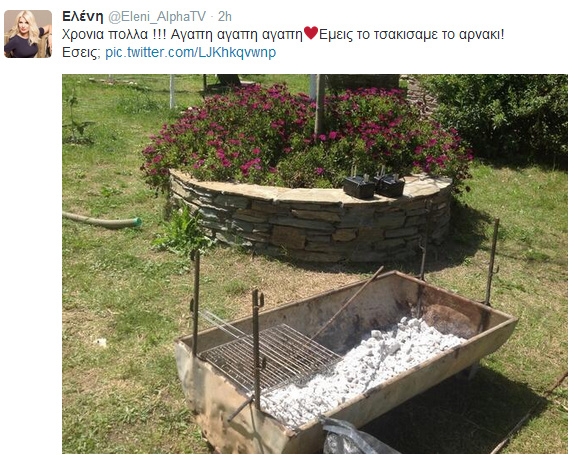 Η παρουσιάστρια πέρασε την ημέρα γιορτάζοντας με παραδοσιακό τρόπο. Έψησαν το αρνί και τσούγκρισαν κόκκινα αυγά. Μάλιστα μετά το φαγοπότι η Ελένη Μενεγάκη έβγαλε φωτογραφία την άδεια ψησταριά και ευχήθηκε χρόνια πολλά στους διαδικτυακούς της φίλους στο twitter. «Χρόνια πολλά !!! Αγάπη, αγάπη αγάπη. Εμείς το τσακίσαμε το αρνάκι! Εσείς;».