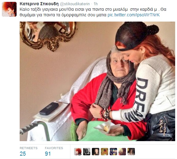 «Έφυγε» από τη ζωή η αγαπημένη γιαγιά της Κατερίνας Στικούδη, με την τραγουδίστρια να την αποχαιρετά με πολύ γλυκά λόγια και μια κοινή τους φωτογραφία.