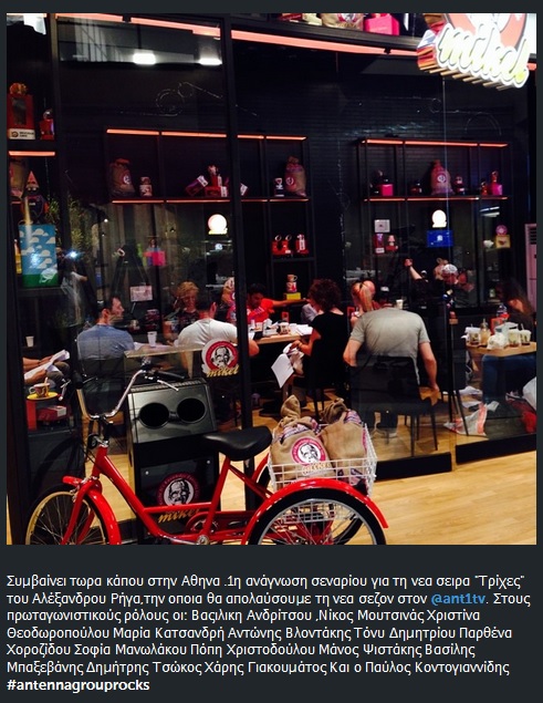 «Συμβαίνει τώρα κάπου στην Αθήνα. 1η ανάγνωση σεναρίου για τη νέα σειρά Τρίχες του Αλέξανδρου Ρήγα, την οποία θα απολαύσουμε τη νέα σεζόν στον @ant1tv. Στους πρωταγωνιστικούς ρόλους οι: Βασιλική Ανδρίτσου, Νίκος Μουτσινάς, Χριστίνα Θεοδωροπούλου, Μαρία Κατσανδρή, Αντώνης Βλοντάκης, Τόνυ Δημητρίου, Παρθένα Χοροζίδου, Σοφία Μανωλάκου, Πόπη Χριστοδούλου, Μάνος Ψιστάκης, Βασίλης Μπαξεβάνης, Δημήτρης Τσώκος, Χάρης Γιακουμάτος και ο Παύλος Κοντογιαννίδης #antennagrouprocks», έγραψε χαρακτηριστικά.