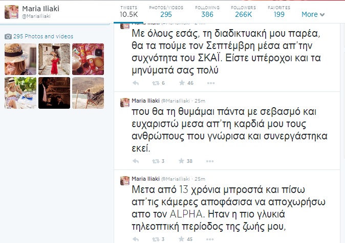 «Μετα από 13 χρόνια, μπροστά και πίσω απ’τις κάμερες, αποφάσισα να αποχωρήσω απο τον ALPHA. Ηταν η πιο γλυκιά τηλεοπτική περίοδος της ζωής μου, που θα τη θυμάμαι πάντα με σεβασμό και ευχαριστώ μεσα απ’τη καρδιά μου τους ανθρώπους που γνώρισα και συνεργάστηκα εκεί.