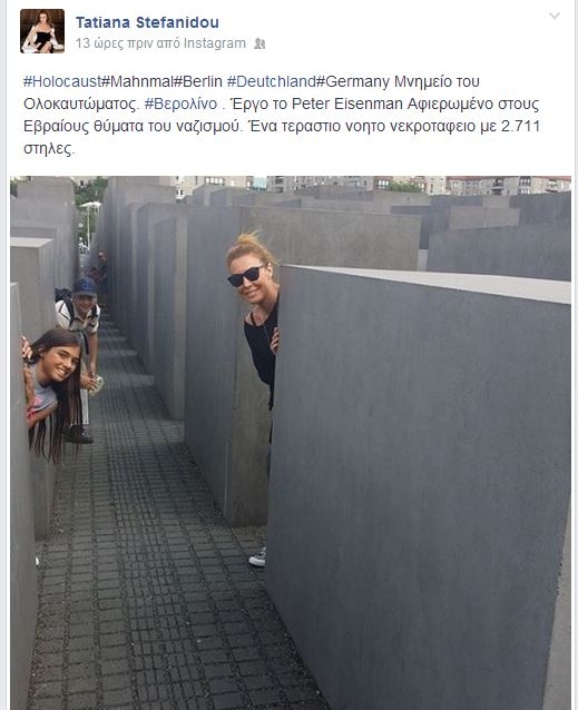 Η παρουσιάστρια μετά τις διακοπές στα ελληνικά νησιά, βρίσκεται τώρα στην Γερμανία με τους δικούς της.Η Τατιάνα έκανε βόλτες με τα παιδιά της στο Βερολίνο και βρέθηκε και στο Μνημείο του Ολοκαυτώματος, που μας έδωσε και περαιτέρω πληροφορίες, όπως ότι είναι έργο του Peter Eisenman, αφιερωμένο στους Εβραίους θύματα του ναζισμού. Ένα τεράστιο νοητό νεκροταφείο με 2.711 στήλες. Όμως δεν περίμενε πως η ακόλουθη φωτογραφία θα προκαλούσε αντιδράσεις. Κάτω από τη φωτογραφία έσπευσαν μερικοί να σχολιάσουν αρνητικά την φωτογραφία, όπως: «ΠΛΗΡΩΝΕΙΣ ΕΙΣΙΤΗΡΙΟ Η ΠΗΓΑΙΝΕΙΣ ΔΩΡΕΑΝ ΓΙΑ ΝΑ ΜΗΝ ΞΕΧΑΣΤΕΙ Η ΙΣΤΟΡΙΑ? ΔΕ ΜΠΟΡΕΙ ΟΙ ΓΕΡΜΑΝΟΙ ΝΑ ΜΗ ΒΓΑΛΟΥΝ Κ ΑΠΟ ΕΚΕΙ....»