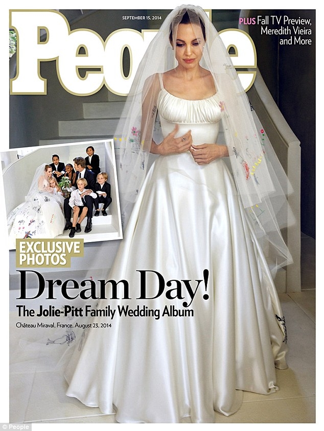 Ακόμα και το νυφικό της Jolie ήταν αποτέλεσμα της έμπνευσης των παιδιών τους! H Luigi Massi, master tailor στον οίκο Versace έραψε πάνω στο πέπλο και το νυφικό ζωγραφιές των παιδιών της.