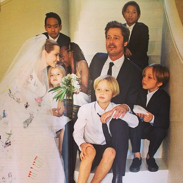 Η διάσημη ηθοποιός επέλεξε μια δημιουργία του ατελιέ Versace και του σχεδιαστή Luigi Massi και ξεχώρισε. Ωστόσο, θέλοντας να δώσει μια πιο προσωπική πινελιά στο νυφικό της και να το κάνει να έχει μεγαλύτερη συναισθηματική αξία, επέλεξε να βάλει στο πίσω μέρος του και στο πέπλο της ζωγραφιές που έκαναν τα έξι παιδιά της. Έτσι, το νυφικό της ήταν πράγματι μοναδικό και έκανε τα μικρά της να χαρούν, ωστόσο κάποιοι το παρομοίασαν με σχέδιο κουρτίνας μπάνιο που βγάζει γνωστή σκανδιναβική εταιρεία με είδη σπιτιού.