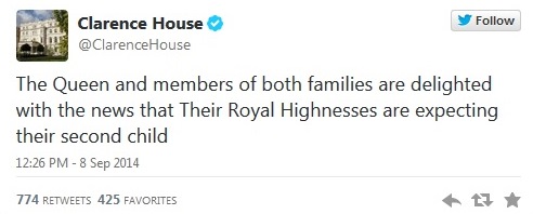 Την ανακοίνωση έκανε, μέσω Twitter το Clarence House, με ένα tweet που αναφέρει: «Η Βασίλισσα και τα υπόλοιπα μέλη της βασιλικής οικογένειας, και της οικογένειας Middleton δηλώνουν πανευτυχείς, με την είδηση ότι οι Αυτών Υψηλότητες περιμένουν το δεύτερο παιδί τους».