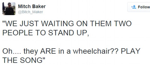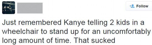 Εκτός φυσικά από την απαίτησή του την οποία εξέφρασε στο μικρόφωνο, όταν συνειδητοποίησε ότι κάποια άτομα είχαν το θράσος να κάθονται, έστειλε τους φρουρούς του να τους σηκώσουν με το ζόρι. Και τότε είναι το... σημείο μηδέν, όπου οι φουσκωτοί του κυρίου West τον ενημέρωσαν ότι οι άνθρωποι αυτοί δεν μπορούσαν να σηκωθούν διότι πολύ απλά ήταν καθηλωμένοι σε αναπηρικό καροτσάκι!