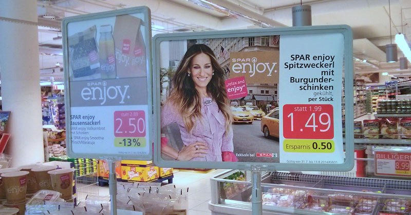Όμως δεν είναι πάντα όλα τα προϊόντα που διαφημίζει λαμπερά και πολυτελή. Πρόσφατα δέχτηκε να διαφημίσει μεγάλη αλυσίδα αυστριακού super market και τα το ωραίο της χαμογελαστό πρόσωπο ποζάρει ανάμεσα σε τρόφιμα και προσφορές στα ράφια.
