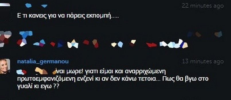 Ο λόγος για την Ναταλία Γερμανού και την φωτογραφία που «ανέβασε» χθες, φορώντας ένα παρεό με θέα την θάλασσα. Αναμφισβήτητα η παρουσιάστρια στην εν λόγω φωτογραφία ήταν πολύ σέξι, γεγονός που μάλλον ενόχλησε την follower που της έκανε ένα εντελώς άκομψο σχόλιο, γράφοντας της: «Ε τι κάνεις για να πάρεις μια εκπομπή». Φυσικά η Ναταλία, που έχει μάθει να μιλά έξω από τα δόντια της απάντησε αμέσως γράφοντας: «Ναι μωρέ είμαι και αναρριχώμενη πρωτοεμφανιζόμενη ενζενί κι αν δεν κάνω τέτοια... Πως θα βγω στο γυαλί κι εγώ;».