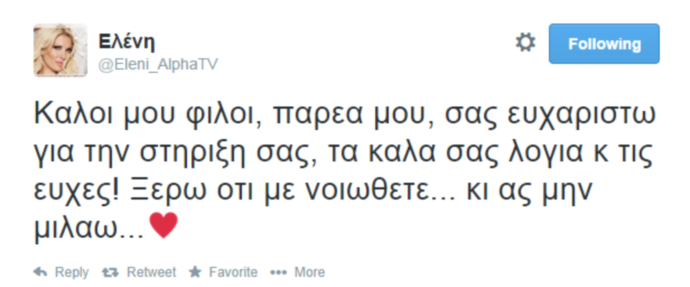 Μάλιστα, η Ελένη Μενεγάκη ευχαρίστησε το διαδικτυακούς της φίλους με ένα μήνυμα, στο οποίο ανέφερε: «Καλοί μου φίλοι, παρέα μου, σας ευχαριστώ για την στήριξη σας, τα καλά σας λόγια και τις ευχές! Ξέρω ότι με νιώθετε... κι ας μην μιλάω...».