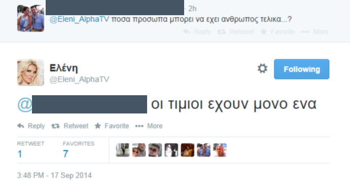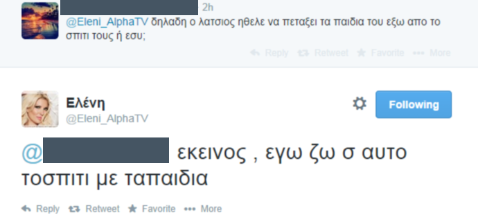 Η Ελένη Μενεγάκη επιβεβαίωσε, μέσω του προσωπικού λογαριασμού της στο twitter, τα πρόσφατα δημοσιεύματα, που ήθελαν τον Γιάννη Λάτσιο να συνεχίζει τη δικαστική τους διαμάχη απαιτώντας πλέον την πώληση του σπιτιού στα Μελίσσια, όπου διαμένει η ίδια με τα τρία της παιδιά, ενώ δεν δίστασε να κάνει και κάποια σκληρά σχόλια για τον πρώην σύζυγό της.Όλα ξεκίνησαν όταν η Ελένη Μενεγάκη αναδημοσίευσε ένα άρθρο που ασκούσε κριτική στον Γιάννη Λάτσιο για τη σκληρή συμπεριφορά απέναντι σε εκείνη και τα παιδιά τους. Ύστερα από αυτό, η διάσημη παρουσιάστρια άρχισε να κάνει retweet δεκάδες μηνύματα συμπαράστασης που δέχτηκε από τους followers της, ενώ απαντώντας σε μηνύματα που δέχτηκε έκανε δημοσίως για πρώτη φορά κάποια σκληρά σχόλια για τον Γιάννη Λάτσιο. Συγκεκριμένα, δες τι απάντησε σε δύο μηνύματα διαδικτυακών της φίλων: