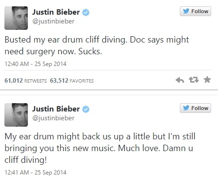 Ο 20χρονος σταρ, που είναι λάτρης των extreme sports και προσπαθεί να... σώσει την εικόνα του, μετά τις συλλήψεις για αλκοόλ και ναρκωτικά, ανακοίνωσε μέσω του twitter πως έσπασε το τύμπανό του, μετά το ριψοκίνδυνο άλμα.
