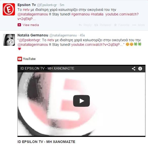 Η επίσημη ανακοίνωση του Ε, ανέφερε τα εξής: «Η ΝΑΤΑΛΙΑ ΓΕΡΜΑΝΟΥ ΣΤΟ #Epsilon! Γράφτηκε, συζητήθηκε, αναλύθηκε και σχολιάστηκε για πολύ καιρό. Το περιμένατε και ήρθε λοιπόν η ώρα να ανακοινώσουμε και επίσημα ότι η Ναταλία Γερμανού ανήκει από σήμερα στο δυναμικό του E TV! Η ταλαντούχα και καταξιωμένη παρουσιάστρια υπέγραψε συμβόλαιο αποκλειστικής συνεργασίας με το E TV και είναι πανέτοιμη να κερδίσει ξανά την καρδιά των τηλεθεατών από το Νοέμβριο, μέσα από το νέο της τηλεοπτικό σπίτι. Μια νέα συνεργασία ξενικά με τις καλύτερες προϋποθέσεις, για αυτό μείνετε συντονισμένοι στο E TV, σας περιμένουν πολλές εκπλήξεις!»