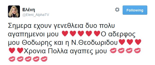 "Σήμερα έχουν γενέθλια δύο πολύ αγαπημένοι μου. Ο αδερφός μου Θοδωρής και η Νατάσα Θεοδωρίδου. Χρόνια Πολλά αγάπες μου»" Με τα λόγια αυτά θέλησε το πρωί της Παρασκευής 24 Οκτωβρίου 2014 η Ελένη Μενεγάκη να ευχηθεί μέσω του προσωπικού της λογαριασμού στο twitter σε αυτά τα δύο πολύ αγαπημένα της πρόσωπα για την ιδιαίτερα μέρα της ζωής τους. Ως γνωστόν η Ελένη Μενεγάκη λατρεύει τον αδερφό της, Θοδωρή Μισόκαλο, ενώ διατηρεί και στενή φιλία εδώ και χρόνια με την Νατάσα Θεοδωρίδου, αφού η παρουσιάστρια υπήρξε κουμπάρα στο γάμο της με τον Ανδρέα Φουστάνο!