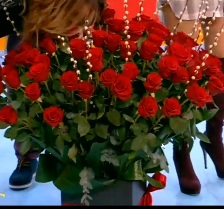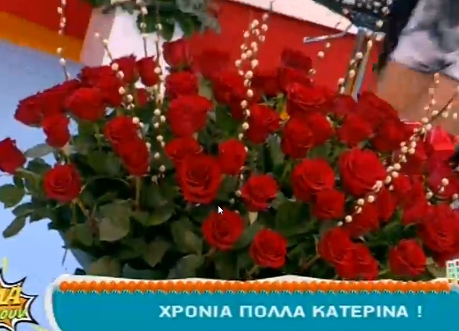 Ο σύντροφος της Κατερίνας Καινούργιου της απέστειλε μια ανθοδέσμη με 100 κατακόκκινα τριαντάφυλλα που κοσμούσε το πλατό της εκπομπής. H έκπληξη δεν μπορούσε παρά να γεμίσει χαρά αλλά και… αμηχανία την παρουσιάστρια στον αέρα της εκπομπής. Η εντυπωσιακή σύνθεση απέσπασε και τα καλύτερα σχόλια των συμπαρουσιαστών της.