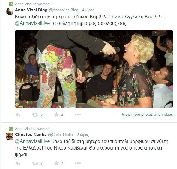 Με μερικά τρυφερά retweets αποχαιρέτησε η Άννα Βίσση την μητέρα του Νίκου Καρβέλα η οποία "έφυγε" από τη ζωή.