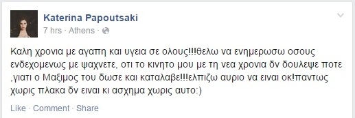 "Καλη χρονια με αγαπη και υγεια σε ολους!!! Θελω να ενημερωσω οσους ενδεχομενως με ψαχνετε, οτι το κινητο μου με τη νεα χρονια δν δουλεψε ποτε ,γιατι ο Μαξιμος του δωσε και καταλαβε!!! Ελπίζω αυριο να ειναι οκ! Παντως χωρις πλακα δεν ειναι κι ασχημα χωρις αυτό" έγραψε χαρακτηριστικά η ηθοποιός στο facebook!