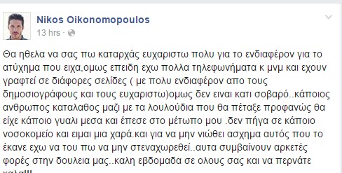 "Θα ήθελα να σας πω καταρχάς ευχαριστώ πολύ για το ενδιαφέρον για το ατύχημα που είχα, όμως επειδή έχω πολλά τηλεφωνήματα και μηνύματα και έχουν γραφτεί σε διάφορες σελίδες (με πολύ ενδιαφέρον από τους δημοσιογράφους και τους ευχαριστώ) όμως δεν είναι κάτι σοβαρό… Κάποιος άνθρωπος καταλάθος μαζί με τα λουλούδια που θα πέταξε προφανώς θα είχε κάποιο γυαλί μέσα και έπεσε στο μέτωπο μου" έγραψε ο Νίκος Οικονομόπουλος στον λογαριασμό του στο facebook σχετικά με το ατύχημα που είχε στο νυχτερινό μαγαζί όπου τραγουδά. Για την ιστορία κάποιος από τα πρώτα τραπέζια του πέταξε ένα αιχμηρό αντικείμενο, κάποιοι κάνουν λόγιο για τασάκι που τον έσκισε στο κεφάλι. Όταν βγήκε ξανά στην πίστα κρατούσε το κεφάλι και είχε ένα τσιρότο όμως ξαφνικά το αίμα άρχιζε να τρέχει ασταμάτητα μπροστά στα μάτια του κόσμου.