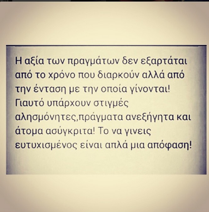 Η ίδια πόσταρε στο Ιnstagram της, μια φωτογραφία που γράφει: "Η αξία των πραγμάτων δεν εξαρτάται από το χρόνο που διαρκούν, αλλά από την ένταση με την οποία γίνονται! Γι΄αυτό υπάρχουν στιγμές αλησμόνητες, πράγματα ανεξήγητα και άτομα ασύγκριτα! Το να γίνεις ευτυχισμένος, είναι απλά μια απόφαση!"