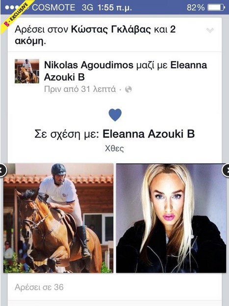 Πριν από λίγες μέρες η Ιωάννα Πηλιχού μας ενημέρωσε για τον αρραβώνα της, ενώ στη συνέχεια αποκάλυψε πως δεν ήθελε να το δουν όλοι οι διαδικτυακοί της φίλοι... Πριν από λίγες ώρες ενημερωθήκαμε μέσα από το facebook ότι υπάρχει νέο ζευγάρι στη showbiz... Ποιο είναι αυτό; Η τραγουδίστρια, Έλενα Αζούκη με τον Νίκο Αγούδημο! Να αναφέρουμε ότι ο επιχειρηματίας ήταν ζευγάρι επί σειρά ετών με τη Νάνσυ Αλεξιάδη, αλλά μετά από πέντε χρόνια η σχέση τους τελείωσε... Για να μας ενημερώνουν για τη σχέση τους μέσα από το facebook σημαίνει ότι είναι full in love!