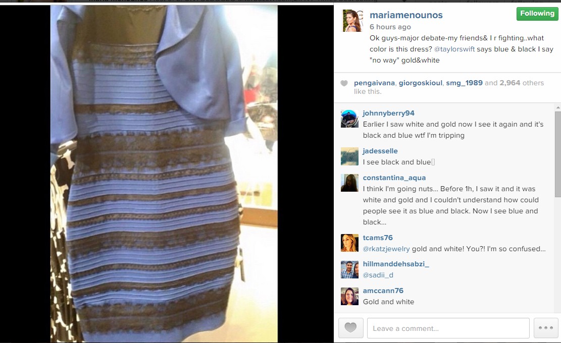 Ποια είναι η αμφιλεγόμενη ερώτηση; "Τι χρώμα είναι το φουστάνι; Λευκό με χρυσό ή μαύρο με μπλε;" Κάποιοι από αυτούς λοιπόν το βλέπουν λευκό με χρυσό και κάποιοι άλλοι μαύρο με μπλε. Μάλιστα η Menounos και η Taylor Swift διαφωνούν καθώς η μία βλέπει τον ένα συνδιασμό χρωμάτων και ή άλλη τον άλλο.