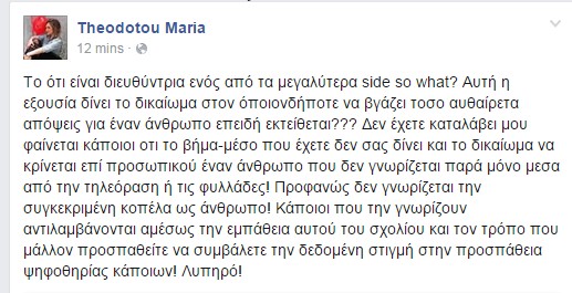 Φαίνεται ότι η Μαρία Έλενα Κυριάκου αρέσει και για αυτό και απασχολεί τόσο πολύ τα ελληνικά media! Διεθύντρια μεγάλου διαδικτυακού μέσου της Ελλάδας σήμερα με ένα post της αναφέρθηκε με όχι και τόσο κολακευτικά σχόλια για την δικιά μας Μαρία Έλενα και φαίνεται πως αυτό ενόχλησε επώνυμους Κύπριους που φρόντισαν να υπερασπιστούν την τραγουδίστρια. Διαβάστε τις έγραψε η διευθύντρια του site αλλά και η Μαρία Θεοδότου για αυτά τα σχόλιά της.