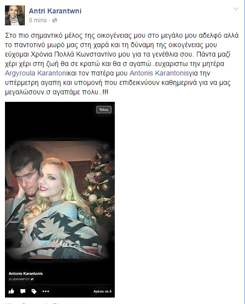 Η Άντρη Καραντώνη ευχήθηκε μέσα απο τα social media της χρόνια πολλά στον αδελφό της Κωνσταντίνο και για τον οποίο έχει μιλήσει αρκετές φορές για την δύναμη που δίνει στην οικογένεια της μιας και είναι παιδί με ειδικές ανάγκες "Στο πιο σημαντικό μέλος της οικογένειας μου στο μεγάλο μου αδελφό αλλά το παντοτινό μωρό μας στη χαρά και τη δύναμη της οικογένειας μου εύχομαι Χρόνια Πολλά Κωνσταντίνο μου για τα γενέθλια σου. Πάντα μαζί χέρι χέρι στη ζωή θα σε κρατώ και θα σ αγαπώ..ευχαριστω την μητέραArgyroula Karantoniκαι τον πατέρα μου Antonis Karantonisγια την υπέρμετρη αγαπη και υπομονή που επιδεικνύουν καθημερινά για να μας μεγαλώσουν.σ αγαπάμε πολυ..!!!" έγραψε και συγκίνησε όλους.