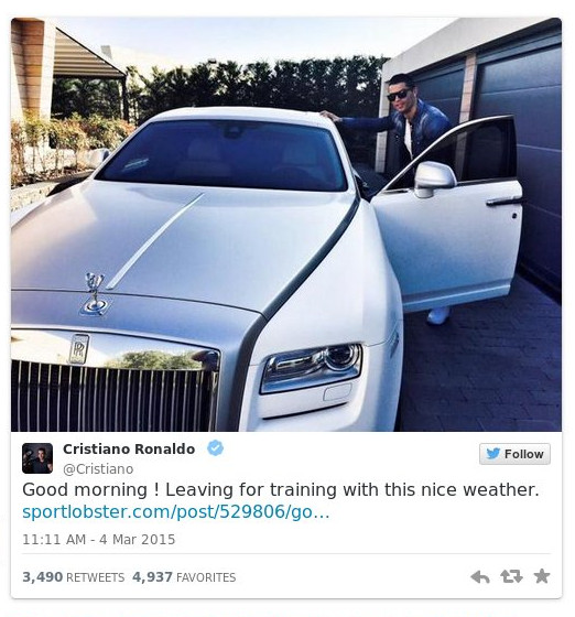 Σήμερα λίγο πριν ξεκινήσει από τη βίλα του για να πάει στην προπόνηση της Ρεάλ Μαδρίτης ανέβασε στο διαδίκτυο φωτογραφία με την πανάκριβη Rolls Royce που έχει στο γκαράζ του σχολιάζοντας: "Καλημέρα. Φεύγω για την προπόνηση με αυτόν τον ωραίο καιρό"