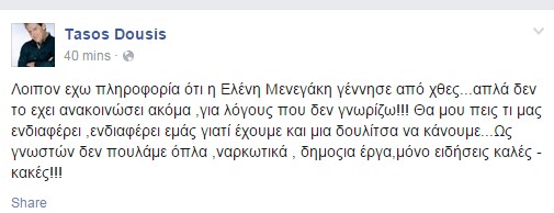 Θρίλερ με την εγκυμοσύνη της θρίλερ και με τη γέννα. Αν και πολλά sites χθες έγραφαν ότι η Ελένη Μενεγάκη έχει γεννήσει το τέταρτο παιδί της εντούτοις η ίδια το διέψευσε μέσα από το λογαριασμό της στο twiter. Το πρωί όμως ο γνωστός εκδότης Τάσος Δούσης ανέβασε το πιο κάτω post στον προσωπικό του λογαριασμό στο facebook δηλώνοντας ότι η Ελένη Μενεγάκη έχει γεννήσει αλλά δεν θέλει να το ανακοινώσει. Διαβάστε τι έγραψε αναλυτικά: