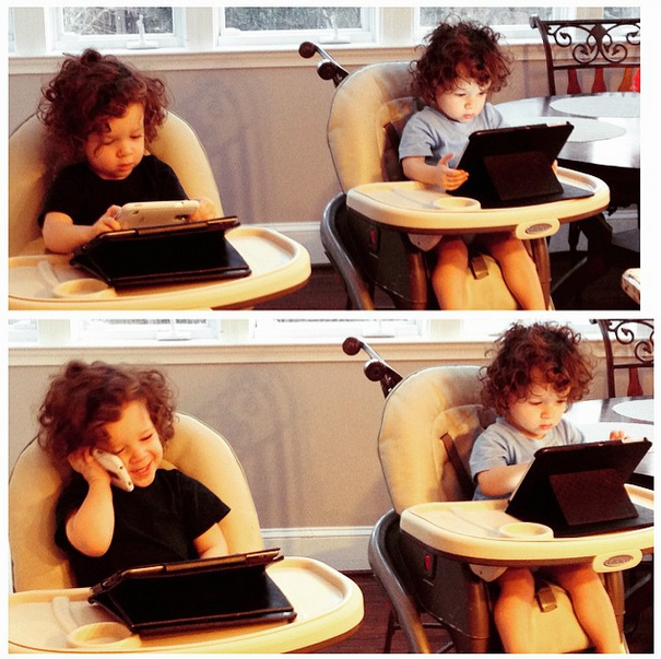 Αυτή τη φορά όμως εξέπληξε όλους η ασχολία των δίδυμων αγοριών της. Τα πιτσιρίκια έπαιζαν ο καθένας με το tablet του ενώ το ένα εκ των δύο κάποια στιγμή μιλούσε στο smartphone.
