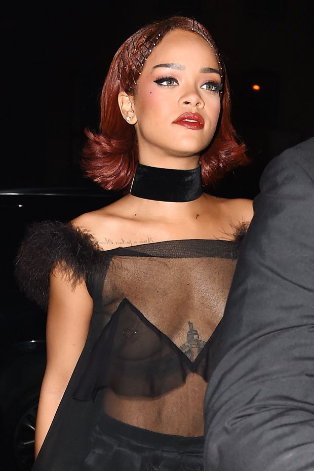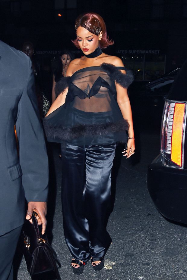 Η Rihanna στο after party του Met Gala που πραγματοποιήθηκε στη Νέα Υόρκη εμφανίστηκε με see-through μπλουζάκι και χωρίς σουτιέν από μέσα. Όπως ήταν φυσικό με μια μικρή χειρονομία της Rihanna στήθος και θηλές… "χαιρέτησαν" τους paparazzi, με το nip slip της τραγουδίστριας να είναι από τα… "λίγα" της διεθνούς showbiz, αφού στην ουσία τα είδαμε όλα! Αν εξαιρέσει κανείς πάντως το πάνω μέρος, από… κάτω η ήταν "πιο σεμνή δεν γίνεται", φορώντας ριχτό σατέν παντελόνι Maison Margiela και ψηλοτάκουνες μαύρες πλατφόρμες Christian Louboutin.