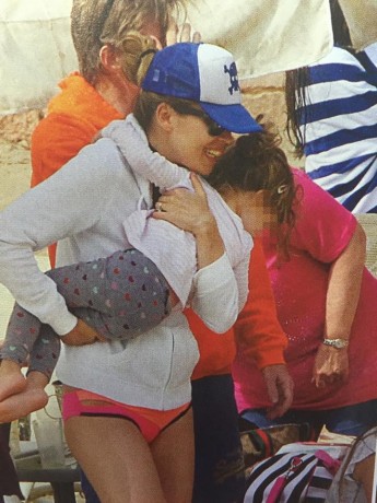 Το μοντέλο και ο σύζυγός της, μαζί με τα παιδάκια τους απόλαυσαν το μπάνιο τους στην παραλία. Άνθρωπος από το φιλικό τους περιβάλλον δήλωσε στο περιοδικό “OK”: “Μπάνιο στην θάλασσα έκαναν μόνο η Μαριέττα και ο Λέων. Η Μαργκώ πέρασε τη μέρα της παίζοντας στην άμμο με τα κουβαδάκια της, ενώ ο αδελφός της βρισκόταν στο καρότσι του, προστατευόμενος από τον ήλιο”.