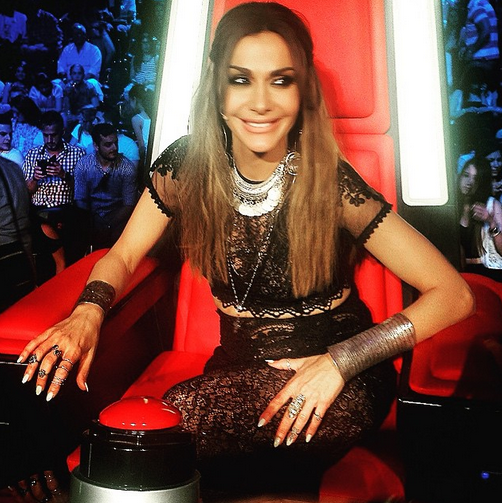 Η coach επέλεξε total black, lace φούστα και crop top, από την προσωπική της συλλογή ρούχων Chip & Chip ενώ το στυλ της ολοκληρώθηκε με boho αξεσουάρ. Εντυπωσιακά, δε, είναι και τα μαλλιά της τραγουδίστριας, τα οποία για σήμερα επέλεξε να αφήσει κάτω, επιμελώς ατημέλητα.