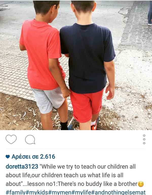 Το βράδυ της Τρίτης η ηθοποιός-παρουσιάστρια πόσταρε στον προσωπικό της λογαριασμό στο Instagram, μία φωτογραφία με τους δύο γιους της όπου δεν φαίνονταν τα πρόσωπά τους. Τα δύο αδέλφια είναι το ένα κοντά στο άλλο. «Ενώ εμείς προσπαθούμε να μάθουμε στα παιδιά μας τα πάντα γύρω από τη ζωή, τα παιδιά μας διδάσκουν τι είναι η ζωή. Μάθημα πρώτο: Δεν υπάρχει κανείς σαν τον αδελφό», έγραψε κάτω από τη φωτογραφία και μέσα σε λίγα λεπτά «βομβαρδίστηκε» από likes και σχόλια διαδικτυακών φίλων και κυρίως γυναικών που συμφώνησαν με τη γνωστή μανούλα.