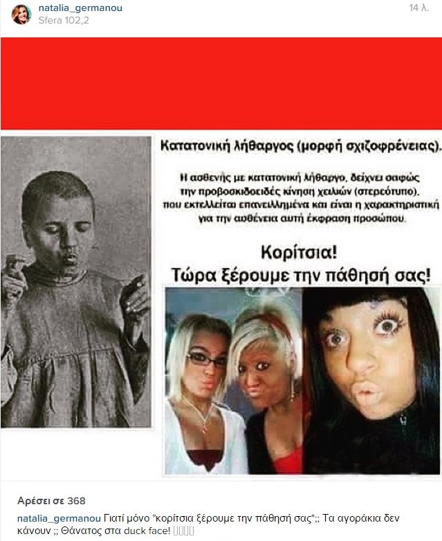 Σε όσους και όσες κάνουν duck face (την χαρακτηριστική πόζα με τα φουσκωμένα χείλη) τα έχωσε μέσω instagram η Ναταλία Γερμανού.